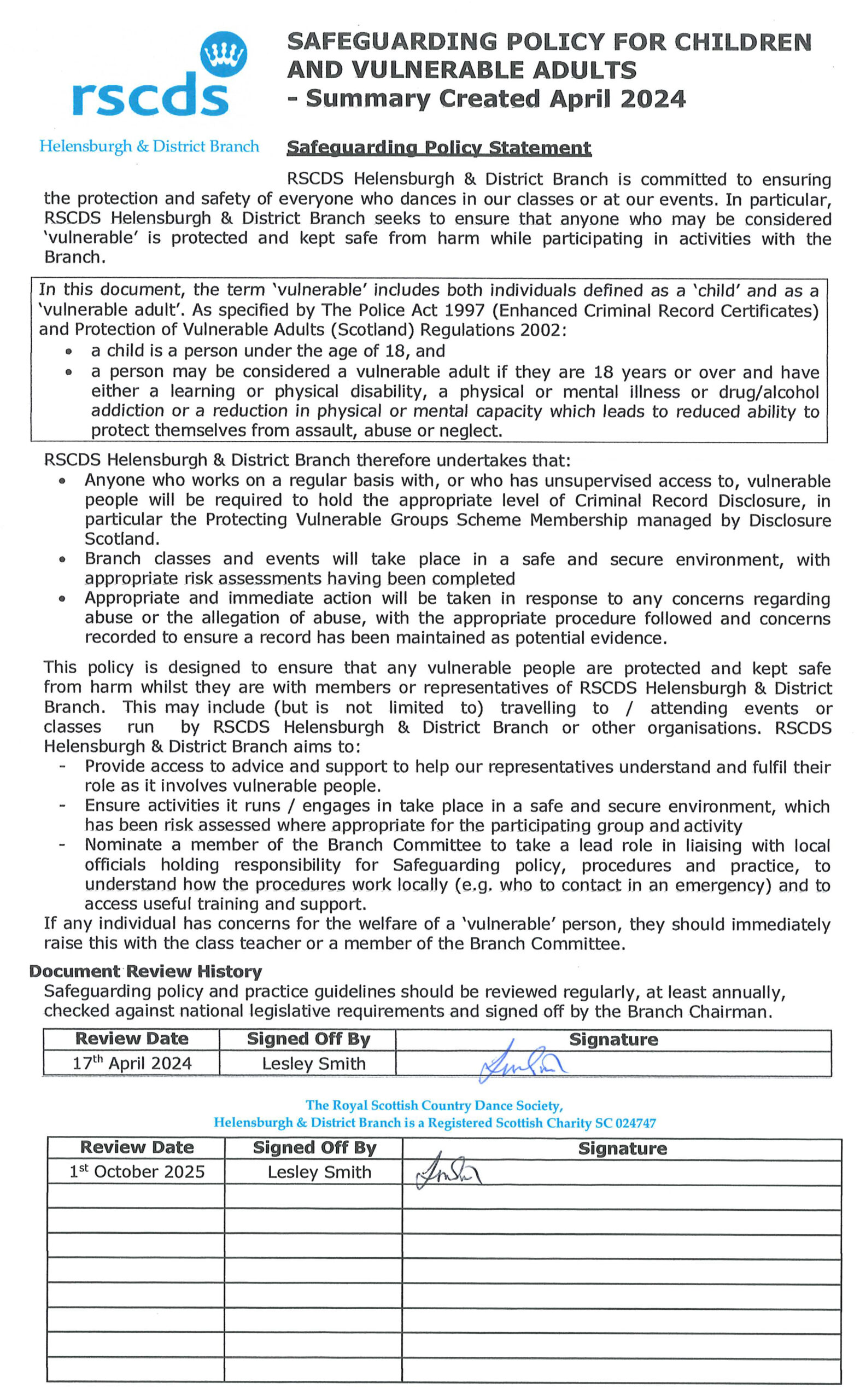 Helensburgh & District Branch Safeguarding Policy for Children and Vulnerable Adults